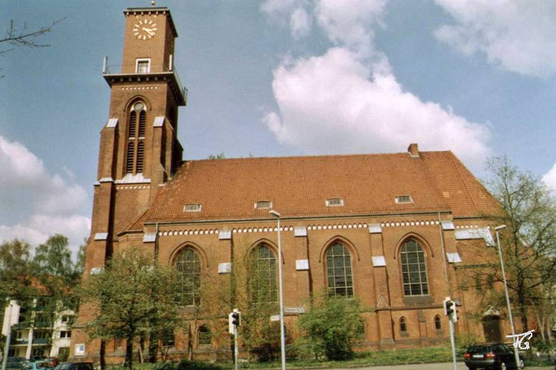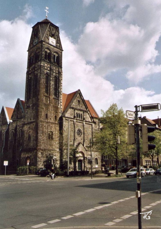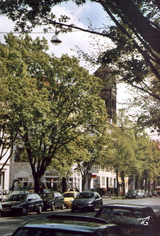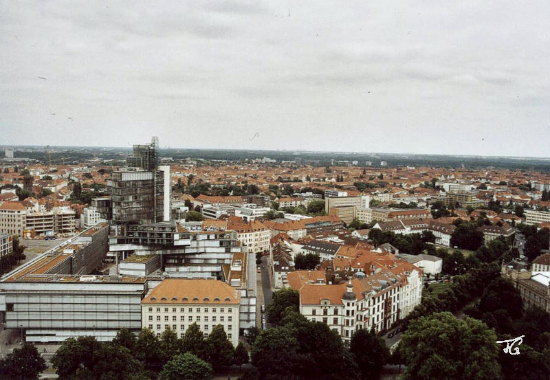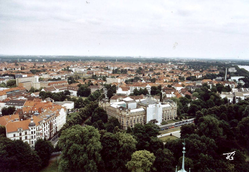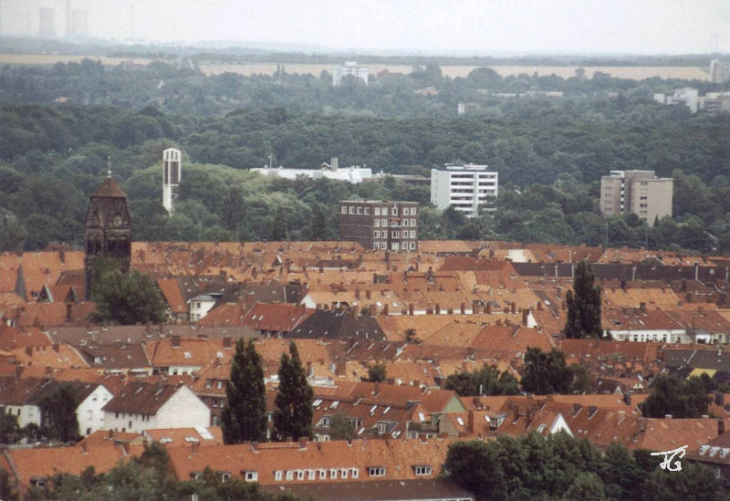 300er Telebild vom neuen Rathaus über die Dächer der Südstadt. Im Bild die Nazarethkirche und der rote Backsteinturm des Geibelplatzes. |