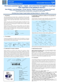 Uwe Schön, Josef Messinger, Florian Genrich, Wladimir Solodenko, Andreas Kirschning »Microwave assisted ligand-, copper- and amine-free Sonogashira couplings. How important is the palladium source?« Advancing Library Design and Organic Synthesis, San Diego February 14 – 17, 2005. |
